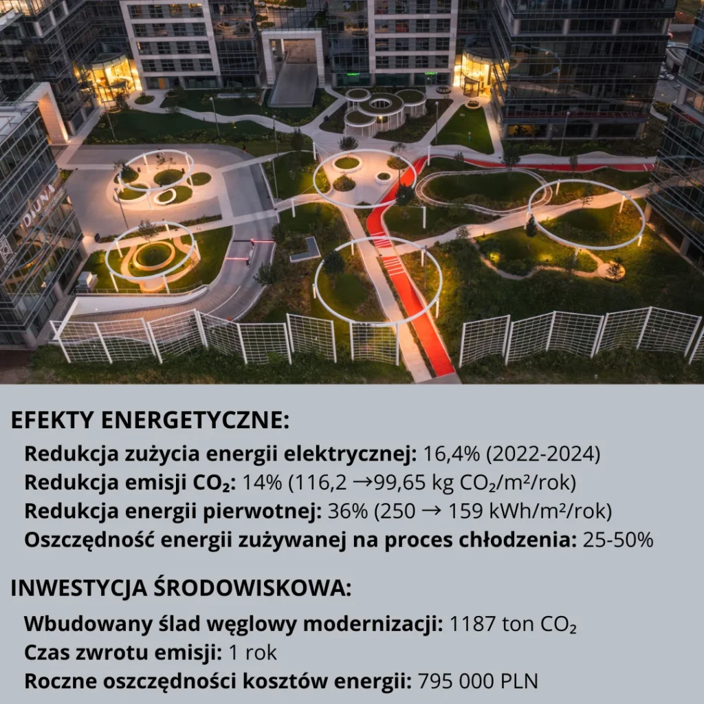 W latach 2022-2024 zużycie energii spadło o 13%, przy jednoczesnym wzroście obłożenia budynku. To potwierdza skuteczność przyjętej strategii i wysoką jakość wdrożonych rozwiązań technicznych.