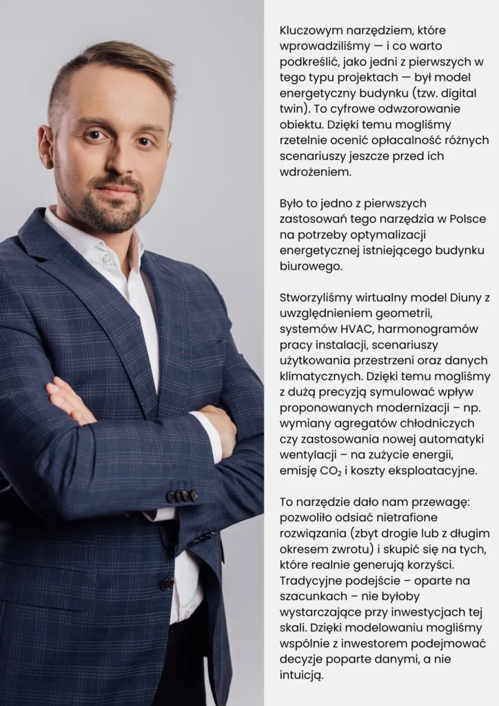 Projekt Diuna pokazuje, że nawet istniejące budynki mogą osiągać bardzo wysoką efektywność energetyczną bez konieczności wyburzeń i budowy od nowa. Kluczowe są tu nie tylko technologie, ale również przemyślane podejście analityczne, właściwe modelowanie energetyczne oraz świadomość inwestora.