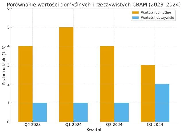 Wykres słupkowy przedstawiający porównanie wartości domyślnych i wartości rzeczywistych CBAM w poszczególnych kwartałach 2023–2024. Skala udziału od 1 do 5, gdzie: 1 = bardzo mały udział; 2 = mniejszy udział; 3 = znaczny udział; 4 = duża dominacja; 5 = najwyższy wskaźnik.