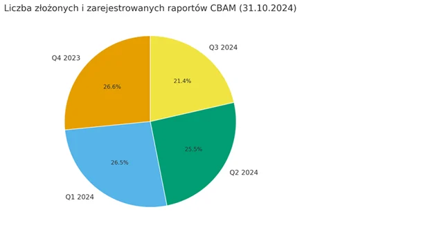Wykres kołowy pokazujący udział liczby raportów CBAM złożonych i zarejestrowanych w poszczególnych kwartałach do 31 października 2024 r