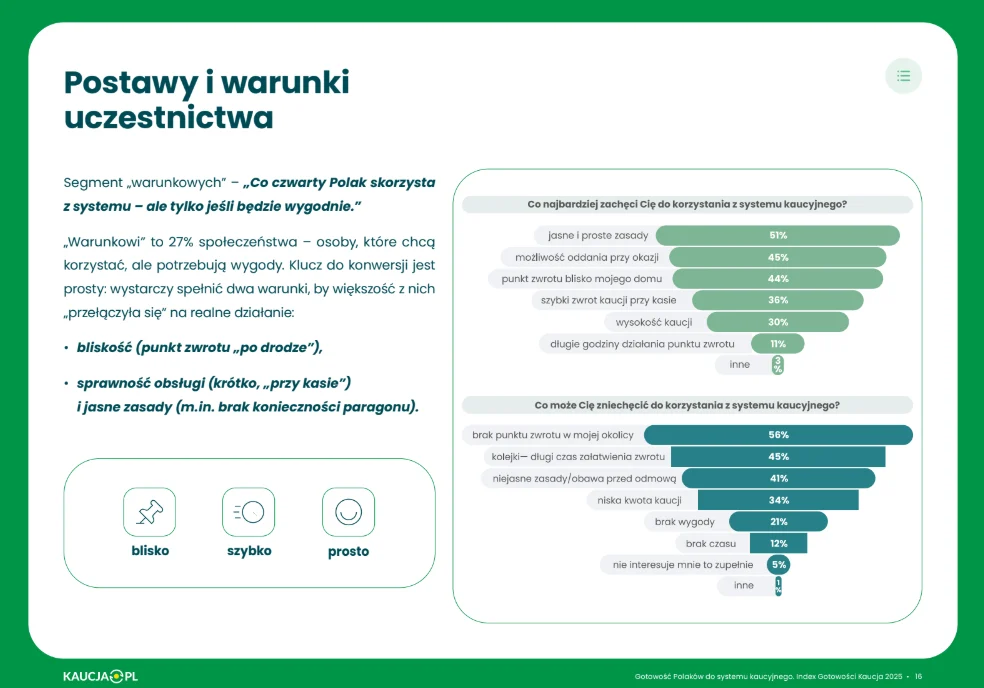 - Warunkowi (27%) – chcą uczestniczyć w systemie, ale tylko jeśli będzie blisko, szybko i bez paragonu