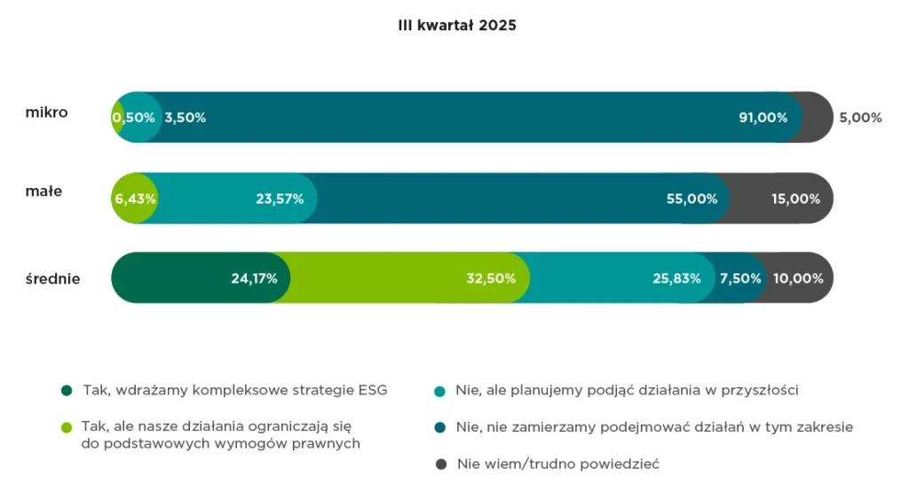 Badanie pokazuje, że wraz ze wzrostem wielkości firmy zmienia się również sposób postrzegania ESG. Wśród mikroprzedsiębiorstw jedynie 1% traktuje ten obszar działań jako inwestycję w przyszłość, podczas gdy wśród małych ten odsetek sięga już 11%, a w średnich aż 58%.