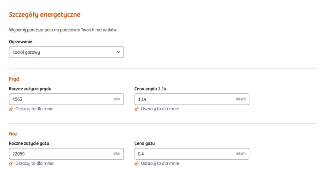 Konieczne jest podanie zużycia energii i ich cen, więc warto mieć pod ręką faktury za media za ostatni rok. A co jeśli ich nie mamy? Kalkulator jest w stanie oszacować ceny prądu, gazu, a nawet podać jakie może być ich roczne zużycie dla budynku o podobnej charakterystyce.