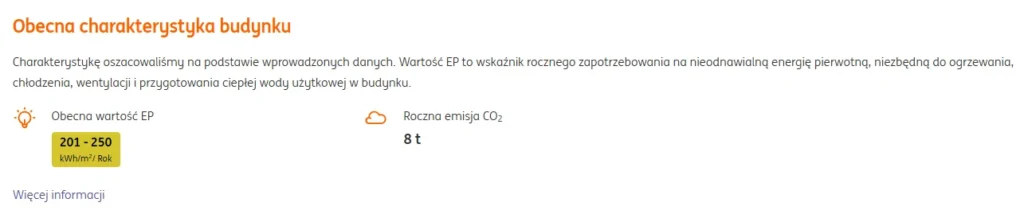 Kalkulator pokazał, że obecnie EP naszego budynku znajduje się w przedziale 201-250 kWh/m2/rok. Żółty kolor etykiety oznacza, że nasz dom nie jest najgorszy z perspektywy efektywności energetycznej, ale zdecydowanie jest pole do poprawy.