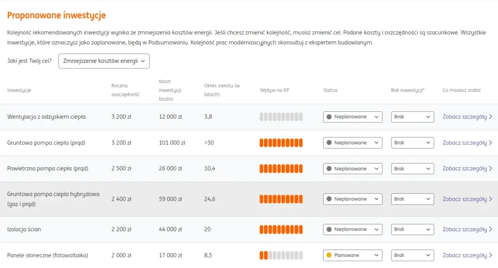 Co ważne, pokazuje również okres zwrotu inwestycji, a więc właściciel domu może ocenić, które działania szybciej się „zwrócą”, a które wymagają dłuższego horyzontu czasowego