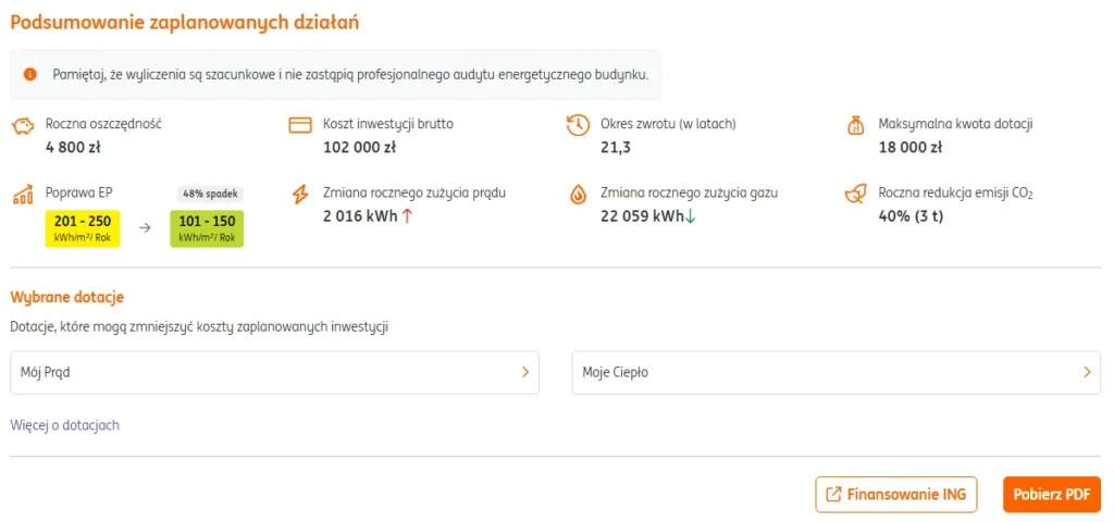 Na koniec kalkulator podsumowuje planowane inwestycje. Pokazuje łączny koszt i łączne potencjalne oszczędności oraz okres zwrotu inwestycji. W przypadku naszego budynku inwestycja powinna się zwrócić po około 21 latach. Sporo, ale warto wspomnieć, że na inwestycje związane z termomodernizacją budynków można uzyskać dotacje np. z programu Czyste Powietrze. To też podpowiada nam kalkulator wyświetlając najbardziej popularne dotacje dopasowane do inwestycji, które wybraliśmy. Można też sprawdzić finansowanie w ING Banku Śląskim, takie jak kredyt na energooszczędną modernizację lub pożyczka na lepsze.