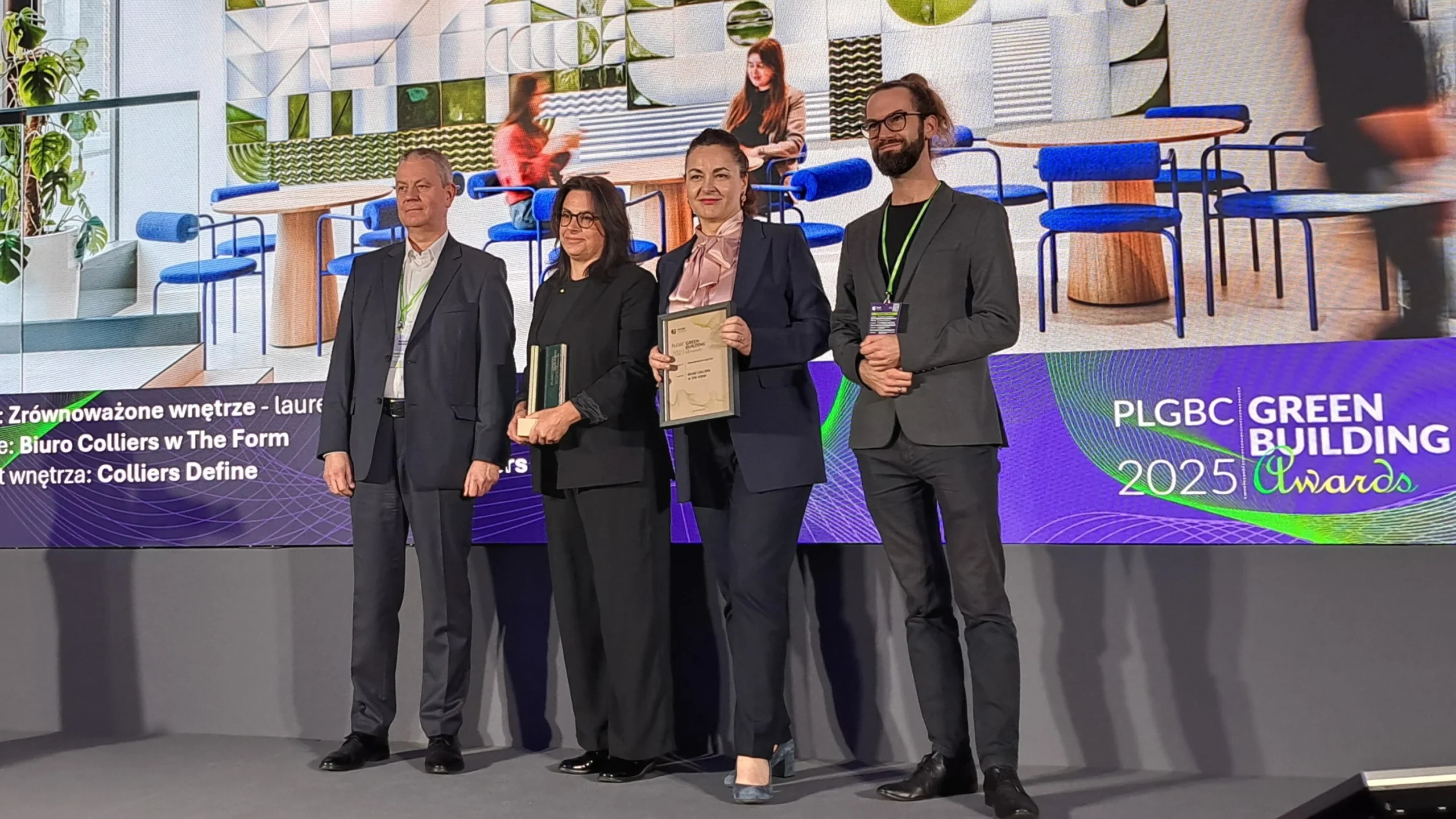 Nowa siedziba Colliers w warszawskim budynku The Form zdobyła główną nagrodę w prestiżowym konkursie PLGBC Green Building Awards 2025 w kategorii Zrównoważone Wnętrze. Jury doceniło projekt za jego kompleksowe podejście do zrównoważonego rozwoju, innowacyjność oraz koncentrację na dobrostanie użytkowników.