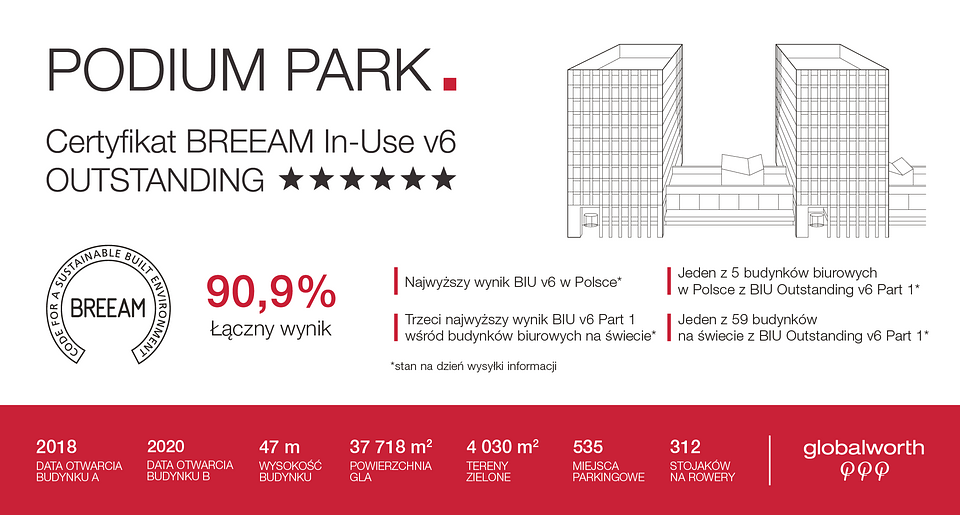 Kolejny budynek z portfela Globalworth, Podium Park, otrzymał Certyfikat BREEAM In-Use v6 Outstanding. Przyznanie krakowskiemu kompleksowi biurowemu łącznej punktacji 90,9 proc. jest obecnie najwyższym wynikiem w Polsce i trzecim rezultatem w rankingu światowym wśród budynków biurowych.