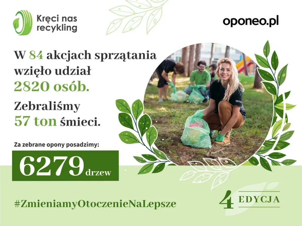 Czwarta edycja kampanii „Kręci nas recykling” zakończona rekordem – wolontariusze z całej Polski zebrali 57 ton śmieci i 25 tysięcy zużytych opon. W ramach proekologicznej akcji, organizowanej przez Oponeo.pl, posadzonych zostanie 6279 drzew. To najlepszy wynik w historii tej ogólnopolskiej inicjatywy na rzecz recyklingu opon i ochrony środowiska.