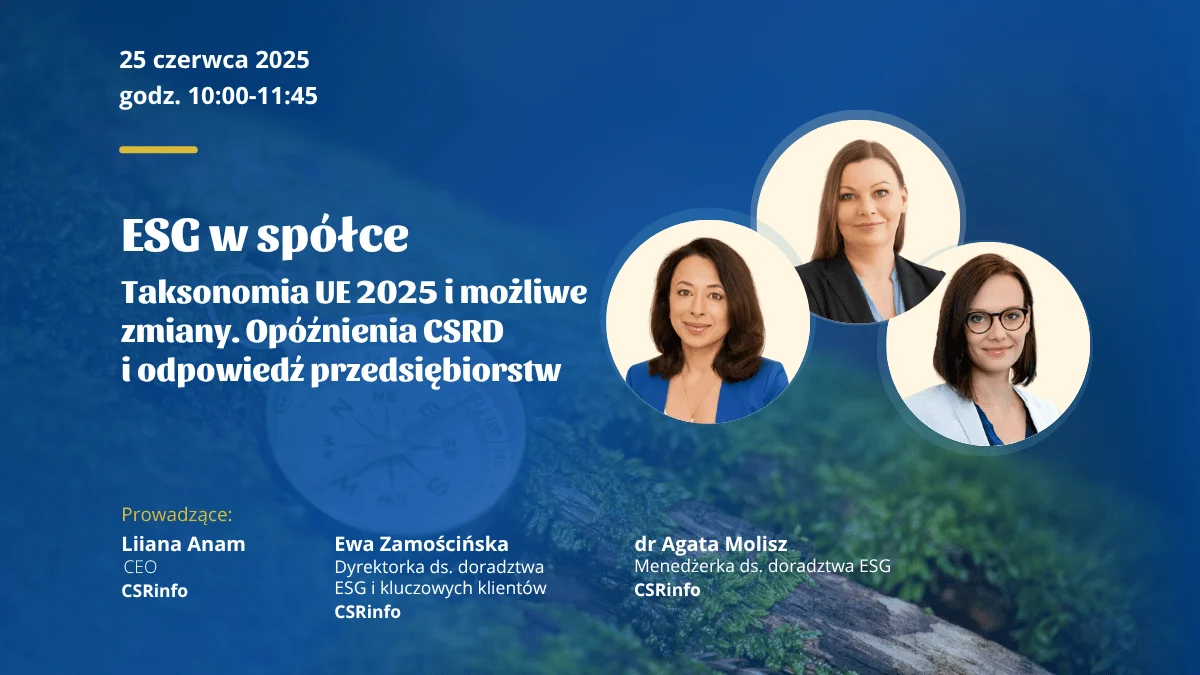 W ostatnim spotkaniu przed wakacjami CSRinfo podsumuje status sprawozdawczości ESG i pokaże wartościowe praktyki. Najbliższy bezpłatny webinar edukacyjnych, który poprowadzi Liliana Anam – CEO CSRinfo, odbędzie się w środę 25 czerwca 2025 r. o godz. 10:00 na platformie Zoom.